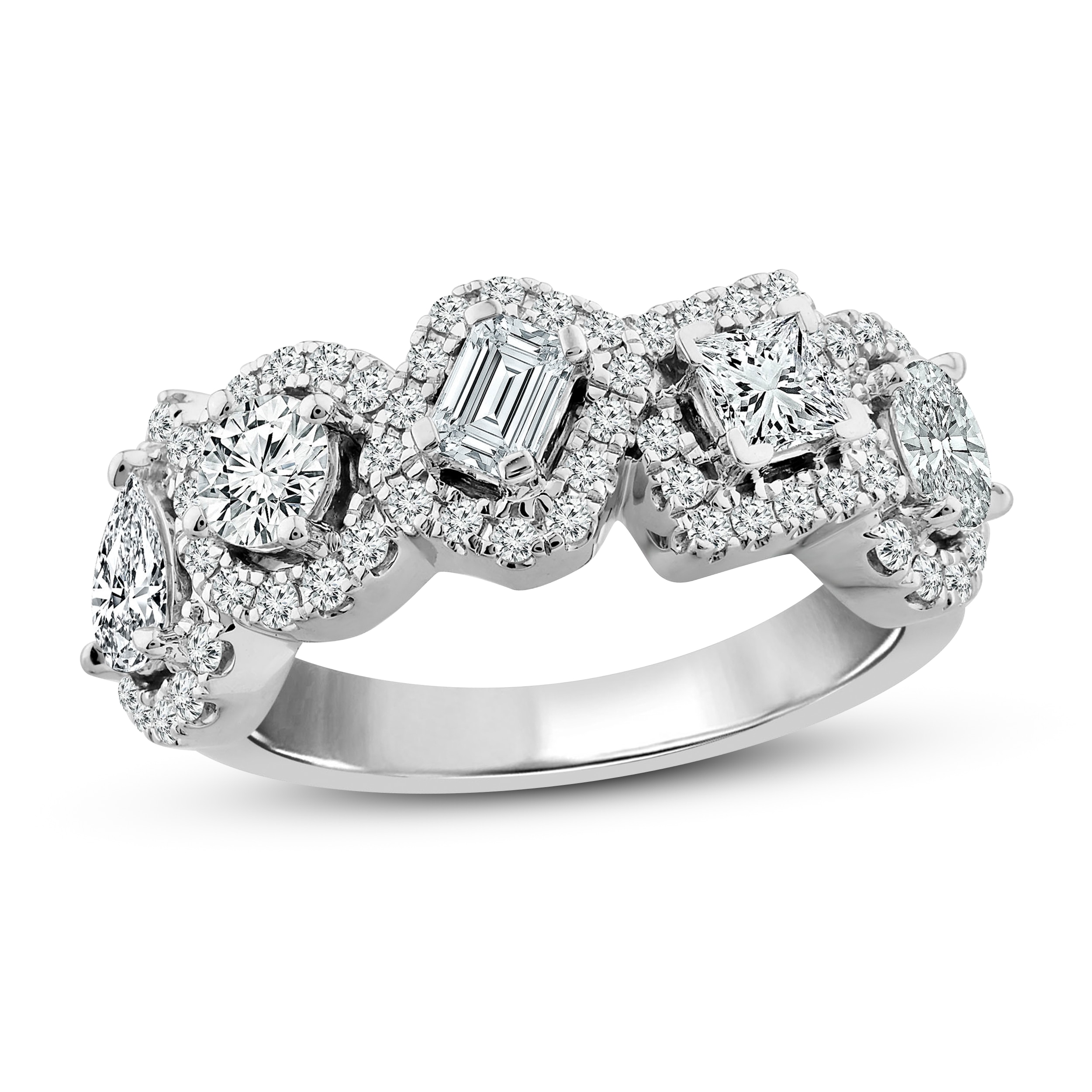 This striking diamond ring collection features five distinctively-shaped diamonds, symbolic of everything she means to you. Each diamond shape has a different meaning, from integrity and wisdom, to confidence, totality, and elegance. This gorgeous 10K white gold ring features a pear-shaped, round-cut, emerald-cut, princess-cut, and oval-cut diamond, each surrounded by a frame of sparkling round-cut diamonds. The ring has a total diamond weight of 1 3/4 carats.