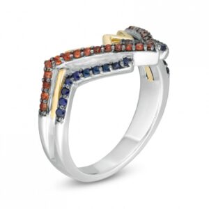Crafted in sterling silver and warm 10K gold, this vibrant ring features royal red garnets, brilliant blue sapphires, and a polished yellow gold ribbon. Polished to a dazzling shine, this silver ring is sure to be admired. This ring is only available in size 7. Sterling silver rings cannot be resized after purchase.