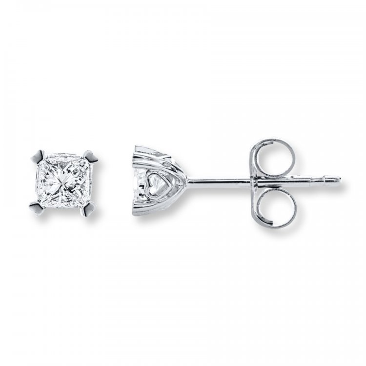 A perfect gift for any occasion, these solitaire earrings for her each shimmer with a princess-cut diamond. Totaling 1/2 carat in diamond weight, the earrings are fashioned in 14K white gold. Friction backs keep the earrings secured.
